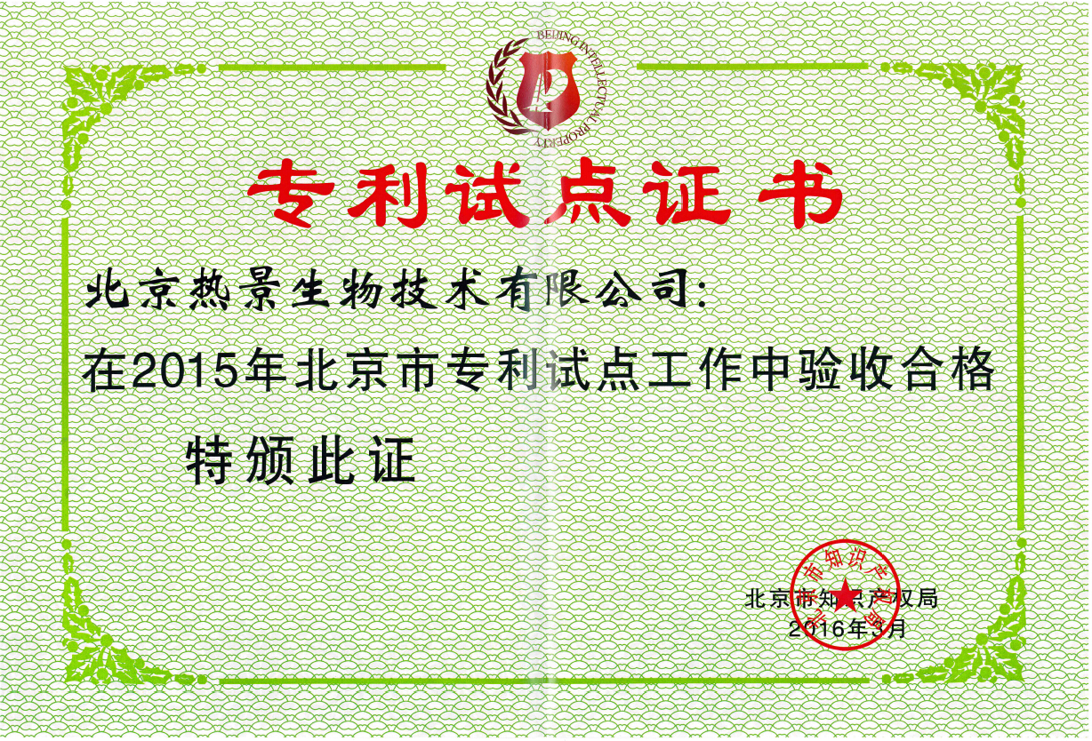 根據(jù)北京市專利試點工作的總體安排,北京市知識產(chǎn)權(quán)局對參加2015年北京市專利試點工作的企事業(yè)單位進(jìn)行了一年的試點培育工作,并與各區(qū)縣知識產(chǎn)權(quán)局、經(jīng)濟(jì)技術(shù)開發(fā)區(qū)知識產(chǎn)權(quán)局共同對有關(guān)企事業(yè)單位進(jìn)行了專利試點考核驗收工作,最終認(rèn)定北京熱景生物為2015年度北京市專利試點驗收合格單位。