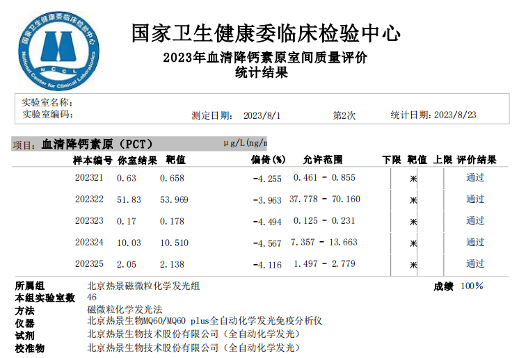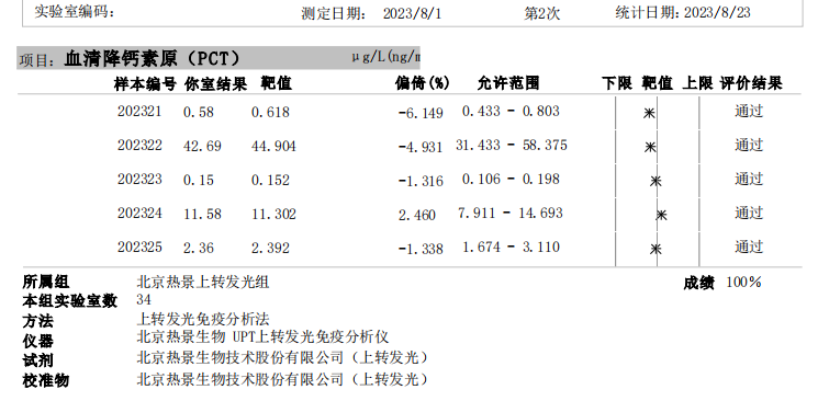 血清降鈣素原(PCT)室間質(zhì)評成績單(UPT、CLIA平臺(tái))