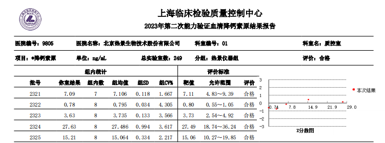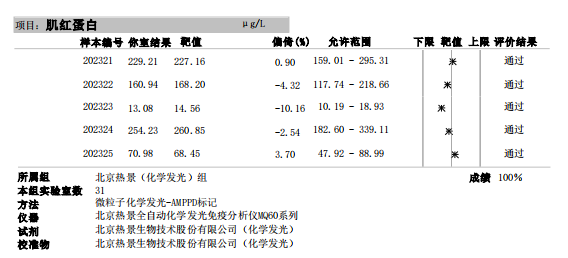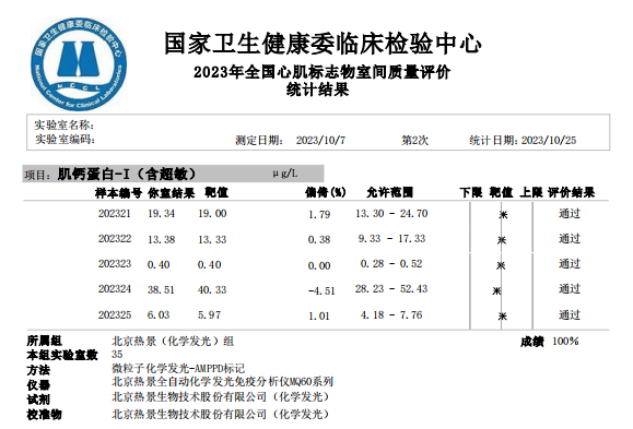 近日,國家衛(wèi)生健康委臨床檢驗(yàn)中心(NCCL)公布了2023年第二次全國臨床檢驗(yàn)室間質(zhì)量評價(jià)結(jié)果。經(jīng)了解,熱景生物心肌標(biāo)志物(肌酸激酶同工酶、肌紅蛋白、肌鈣蛋白I)、血清降鈣素原項(xiàng)目的上轉(zhuǎn)發(fā)光及化學(xué)發(fā)光兩大平臺(tái)產(chǎn)品,以及D-二聚體、白介素6、胃蛋白酶原項(xiàng)目的化學(xué)發(fā)光平臺(tái)產(chǎn)品均滿分通過此次室間質(zhì)量評價(jià)。同時(shí),熱景生物參與的上海臨床檢驗(yàn)中心2023年第二次能力驗(yàn)證活動(dòng),包括AFP異質(zhì)體比率、B型鈉尿肽/N末端B型鈉尿肽前體、心肌標(biāo)志物(肌酸激酶同工酶、肌紅蛋白、肌鈣蛋白I)、血清降鈣素原等項(xiàng)目在內(nèi)的產(chǎn)品均通過評價(jià)。