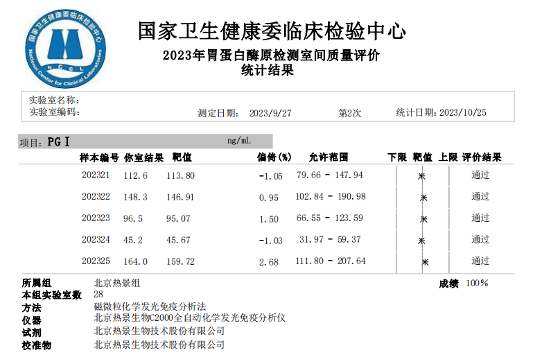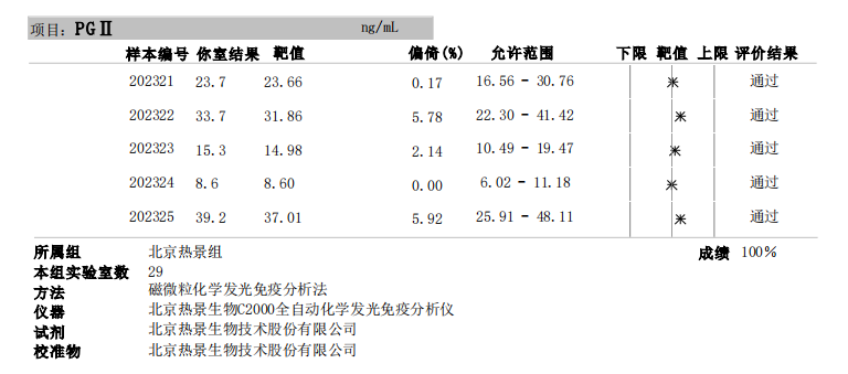 胃蛋白酶原(PGI、PGII、PGI/PGII比率)室間質(zhì)評成績單