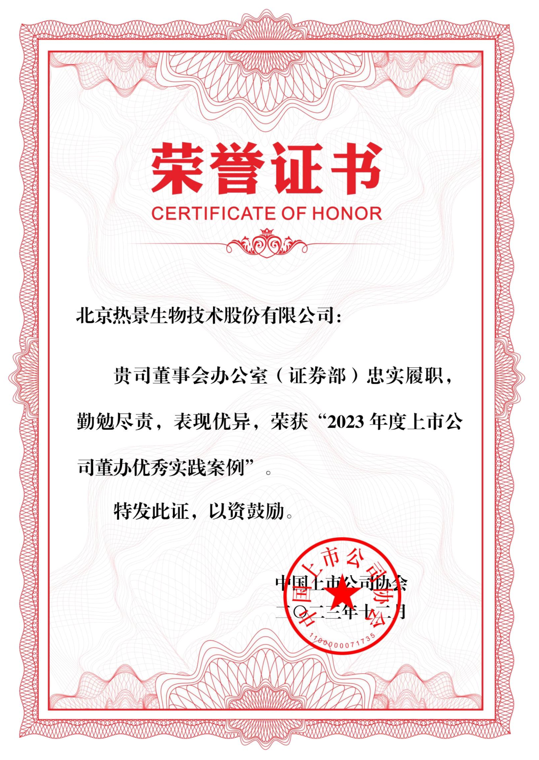 熱景生物獲評中上協(xié)“2023年度上市公司董辦優(yōu)秀實踐案例”