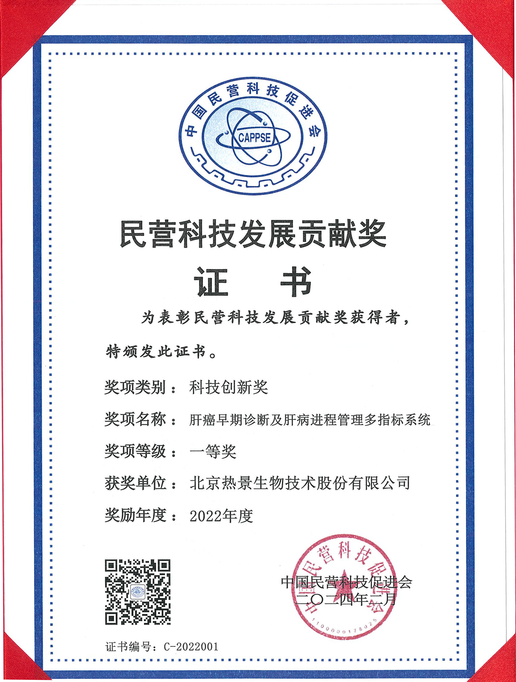 近日,中國民營科技促進會公布了“2022年度民營科技發(fā)展貢獻獎”獲獎企業(yè)名單,熱景生物“肝癌早期診斷及肝病進程管理多指標(biāo)系統(tǒng)”項目榮獲“2022年度民營科技發(fā)展貢獻獎”科技創(chuàng)新一等獎。