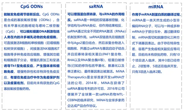 根據(jù)小核酸結(jié)構(gòu)、藥物機(jī)制、作用靶點(diǎn)的不同,發(fā)展出了多種類型,包括反義寡核苷酸(ASO)、小干擾RNA(siRNA)、適配體RNA(aptamer RNA)、微小RNA(miRNA)、小激活RNA(saRNA)和CpG寡核苷酸 (CpG oligonucleotide)、核酶(ribozyme)、轉(zhuǎn)運(yùn)RNA(tRNA)、抗體核酸偶聯(lián)藥物(ARC)等。目前研究最熱門的小核酸藥物主要是ASO、siRNA 和Aptamer。