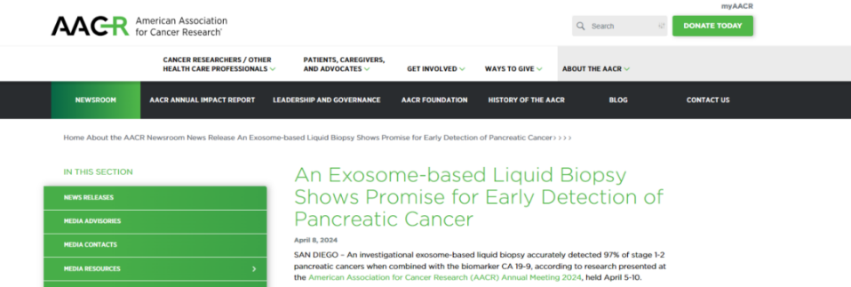 根據2024美國癌癥研究協(xié)會(AACR)年會上發(fā)表的一項研究,在結合生物標志物CA 19-9的情況下,基于外泌體的液體活檢可準確檢測出97%的Ⅰ~Ⅱ期胰腺癌。