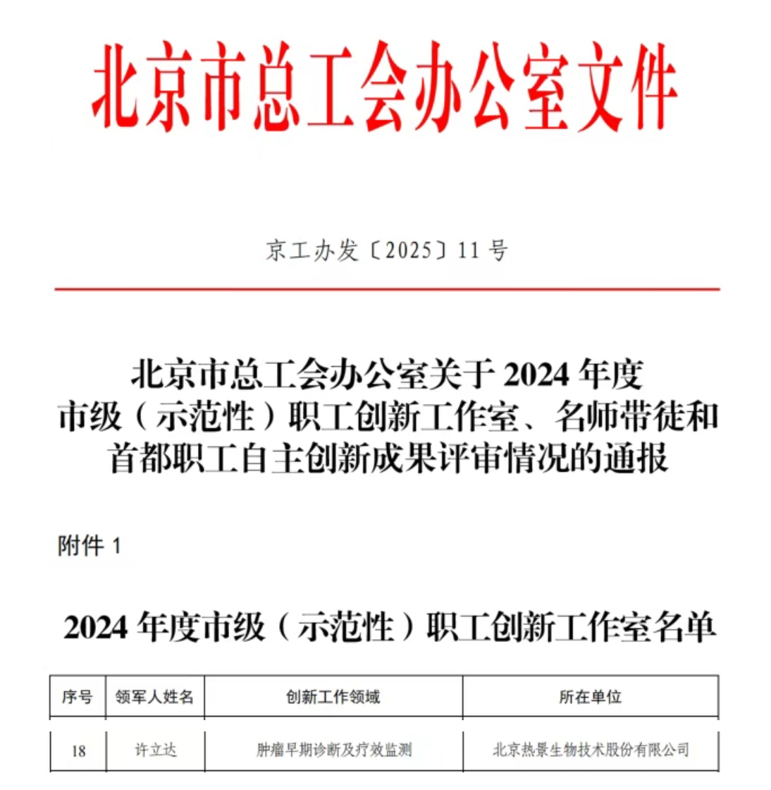 近日,北京市總工會發(fā)布《關(guān)于2024年度市級(示范性)職工創(chuàng)新工作室、名師帶徒和首都職工自主創(chuàng)新成果評審情況的通報》,熱景生物許立達(dá)研究員領(lǐng)軍的“腫瘤早期診斷及療效監(jiān)測”創(chuàng)新團(tuán)隊榮獲“北京市級職工創(chuàng)新工作室”稱號,該稱號是對工作室在腫瘤精準(zhǔn)診斷領(lǐng)域持續(xù)創(chuàng)新與技術(shù)轉(zhuǎn)化卓越貢獻(xiàn)的權(quán)威認(rèn)可。創(chuàng)新驅(qū)動腫瘤診斷革新該工作室專注于腫瘤早期診斷與療效監(jiān)測技術(shù)的研發(fā),依托公司核心原創(chuàng)技術(shù),成功搭建起獨具特色的多組學(xué)診斷技術(shù)平臺,實現(xiàn)外泌體、蛋白、核酸等腫瘤標(biāo)志物從發(fā)現(xiàn)到臨床轉(zhuǎn)化的貫通,助力腫瘤精準(zhǔn)診療。