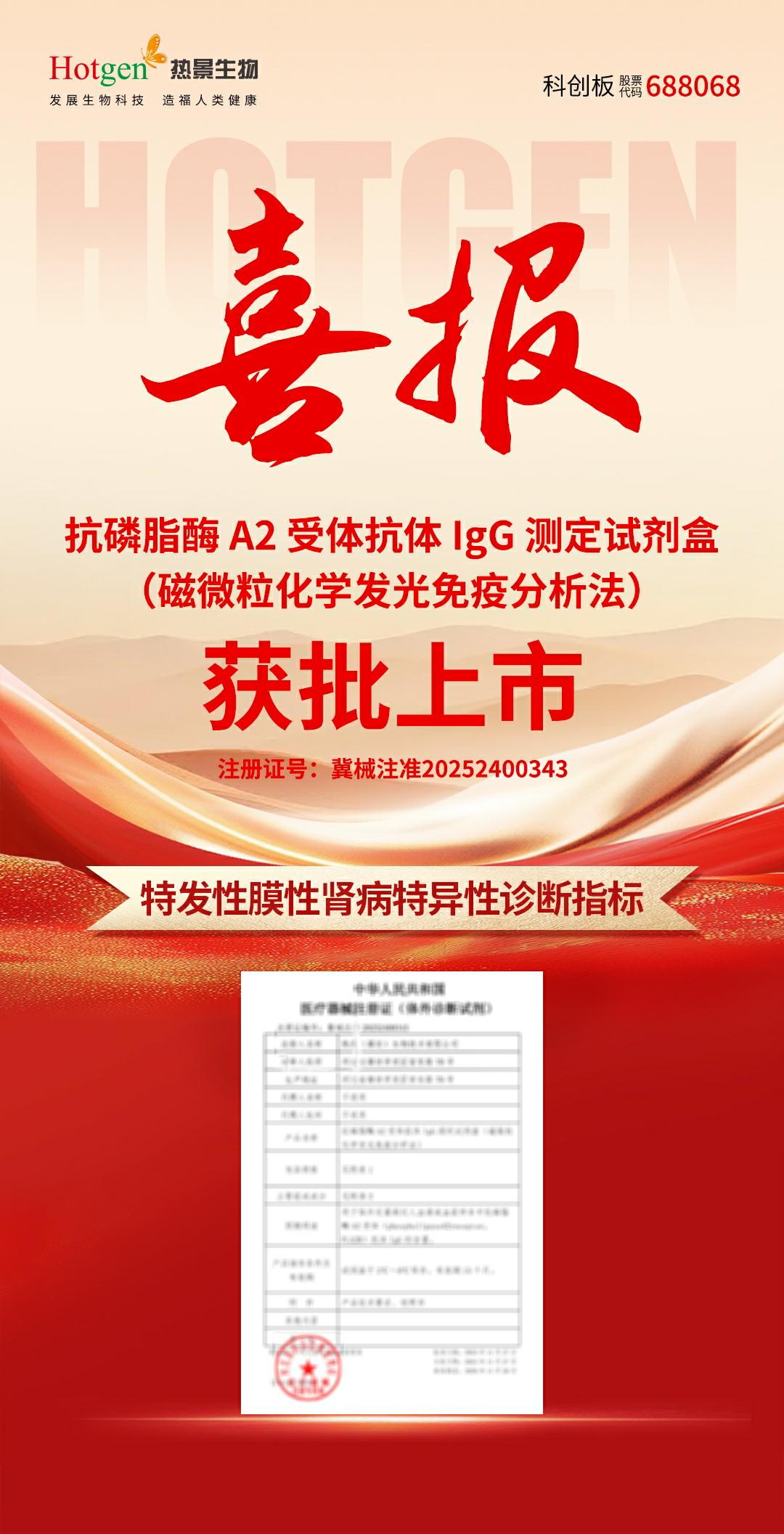近期北京熱景生物憑借深厚的研發(fā)積淀與技術(shù)創(chuàng)新實(shí)力,成功斬獲一項(xiàng)新的醫(yī)療器械注冊(cè)證 ——抗磷脂酶 A2 受體抗體 IgG 測(cè)定試劑盒(磁微粒化學(xué)發(fā)光免疫分析法)正式通過河北省藥品監(jiān)督管理局批準(zhǔn)!這一突破豐富了熱景生物在腎病診斷領(lǐng)域的產(chǎn)品矩陣,為臨床診療提供更為高效的檢測(cè)方案,進(jìn)一步引領(lǐng)膜性腎病精準(zhǔn)檢驗(yàn)。