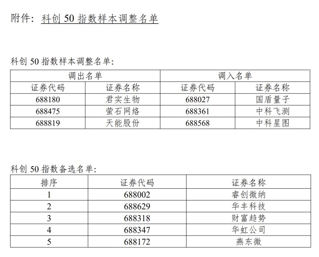 2月27日,上交所和中證指數(shù)公司聯(lián)合發(fā)布公告,根據(jù)指數(shù)編制規(guī)則,科創(chuàng)50等科創(chuàng)指數(shù)樣本每季度進(jìn)行定期調(diào)整,本次調(diào)整將于3月13日收市后實(shí)施。